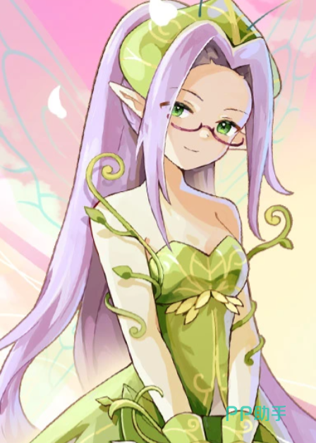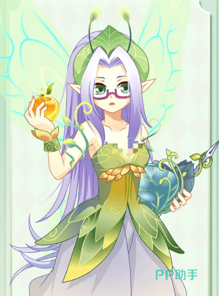 其足踏绿色高跟鞋,紫色长发垂落肩头,佩戴一副同色系眼镜;头顶延伸出柔韧的绿色触角,背后展开一对黄蓝渐变的蝶翼,整体视觉风格兼具学术感与仙灵气息。在剧情设定中,她与主角雪城爱关系密切。于拉贝尔大陆场景中,常见其独坐古树之下专注阅读。