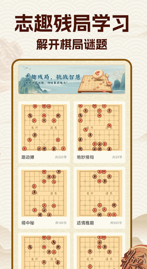 这是象棋迷们不可或缺的一款游戏佳作,它精心设计了两种玩法供玩家选择:一是循序渐进的关卡挑战模式,另一则是充满变数的随机对战模式。其界面设计简约而不失雅致,玩家能一目了然地找到心仪的游戏模式,操作便捷。游戏整体色调采用了护眼的绿色,旨在为玩家营造一个舒适健康的游戏环境,减少长时间游戏对眼睛的负担。此外,游戏还配备了详尽易懂的新手引导教程,即便是象棋初学者也能在轻松愉快的氛围中快速掌握象棋的基本规则与技巧。