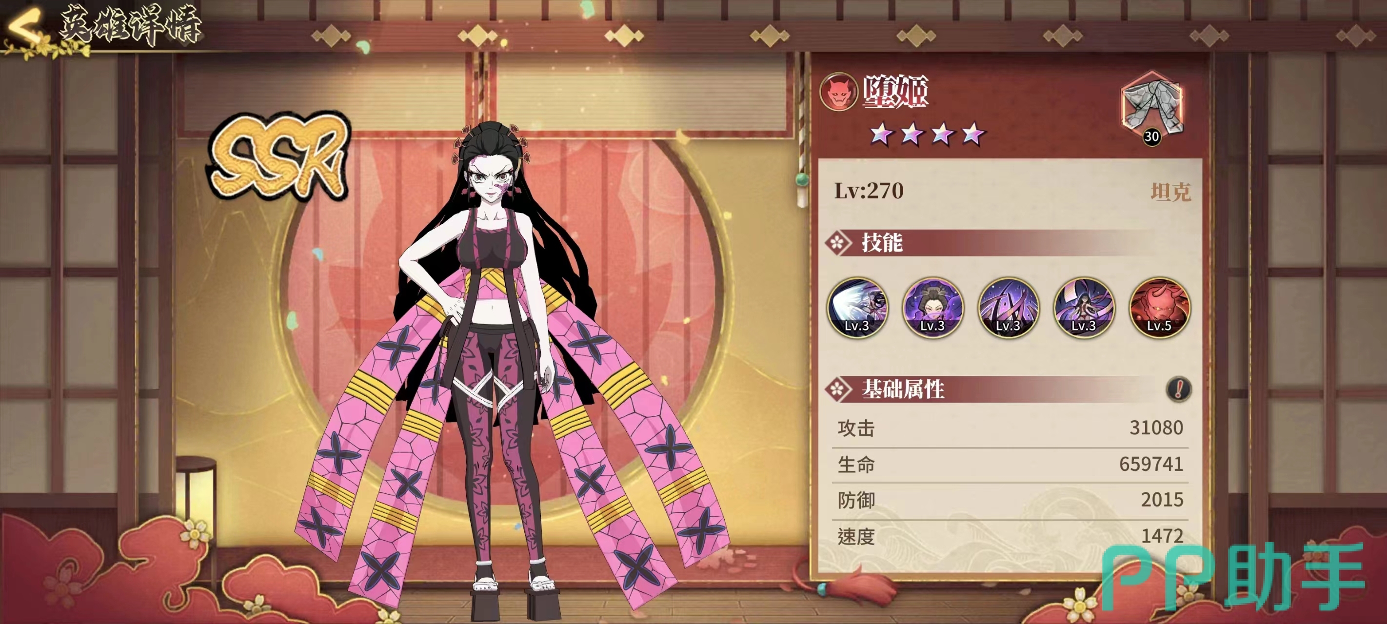堕姬:她的防御和生命属性都非常高,并且对于队友也有一定的保护作用,技能基本都是对前排敌人造成伤害,并且有几率能够降低敌人的攻击力,此外她也有AOE全体伤害,并且如果自身的负面状态被驱散还能增加20%防御,她本身还自带一个伤害分摊技能,不过是帮助队友分摊伤害,所有队友受到的伤害都会有10%伤害由堕姬代替承担。