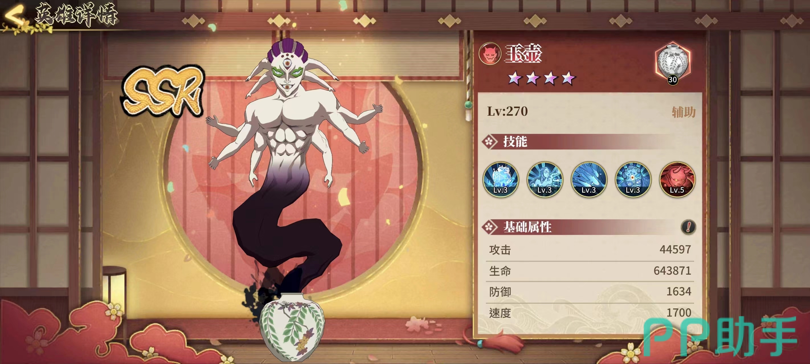 玉壶:这是一个有着超多被动和负面状态的SSR角色,本身的辅助作用极强,属性方面有着较高的生命,能提供极高的容错,得以放出更多的技能。