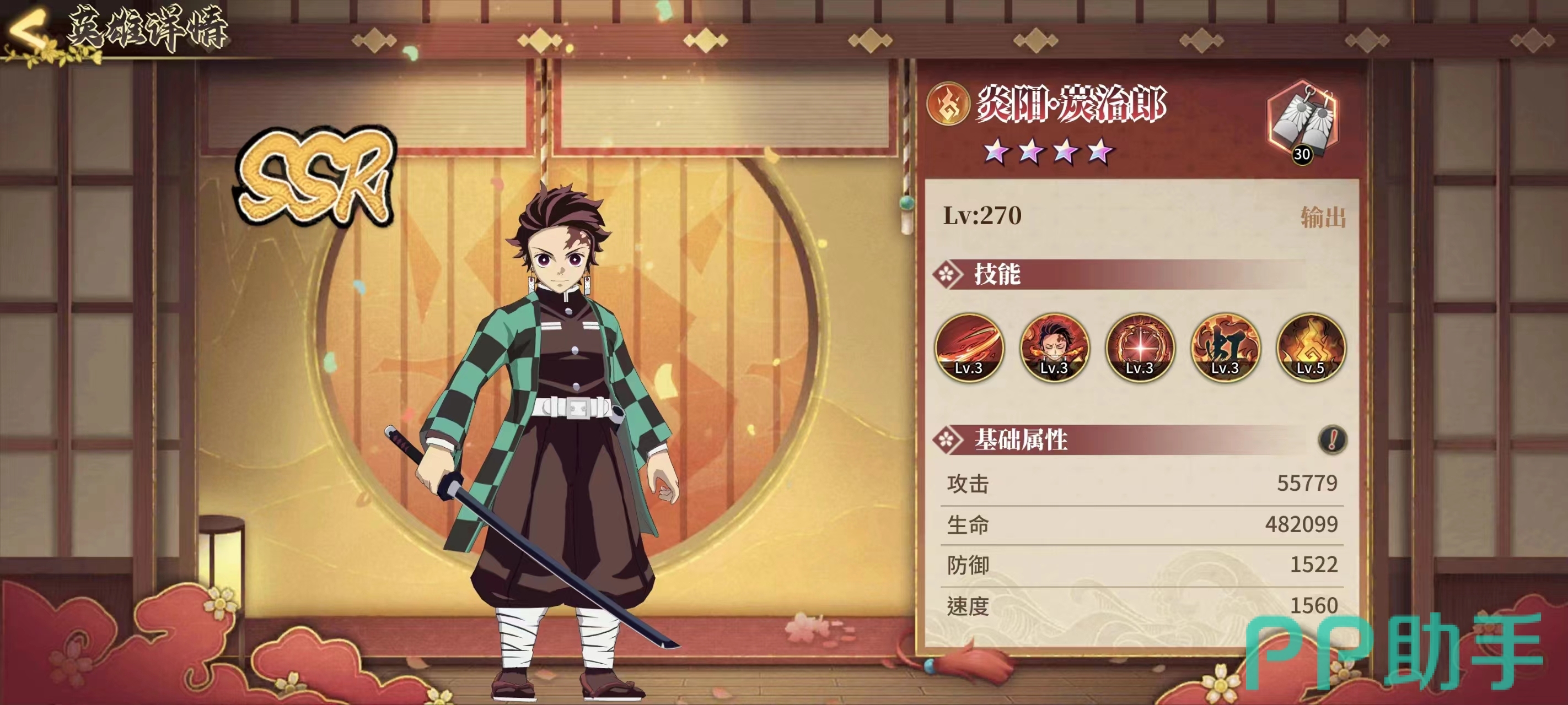 炎阳·炭治郎:该角色SSR中属性最为暴力的一个存在,超五万的攻击足以让他打出极高的爆发伤害,另外他的技能也都有着较高的倍率,其中一技能火之神神乐火车可以对前方目标造成120%伤害并附加灼烧,此后还会对一列敌人造成30%的溅射伤害,被溅射的两个目标还有30%几率会陷入眩晕。