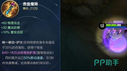 赤金魔陨是个具有吸血与保命的装备,面板上提供60点物攻,23点魔法防御以及10%的伤害吸血效果,带有护主血盾的保命特效,自身低于30%生命时可以提供770以上的吸收护盾并且提供50%的移速加成。比较适合核心C位和部分战士,能够增强续航能力且具有保命效果,面对具有魔攻输出高的英雄对战,很适合对应来出。同样类似的装备还有自然之风,提供30点物攻,20%的额外攻速以及10%吸血效果,但能够提供风吟来免疫3秒内所有物理伤害,面对菜刀队具有奇效,保命神器。