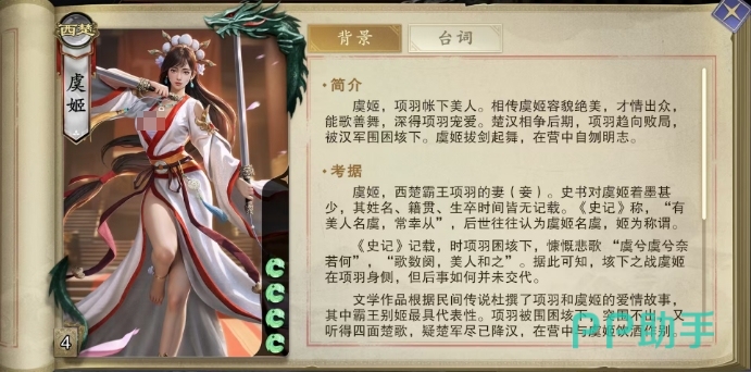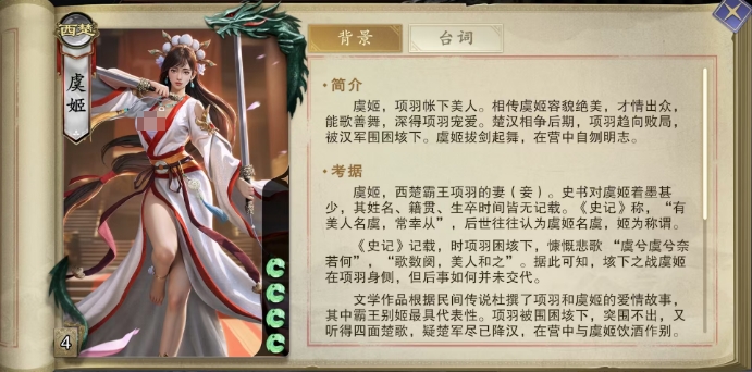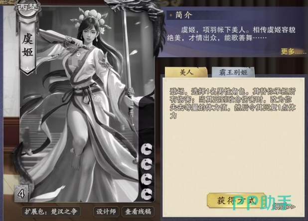 对于初学者而言,面对琳琅满目的武将和错综复杂的技能,往往感到无从下手,因此在在众多武将中,虞姬的技能机制简单,这一点也是带来了很多粉丝的,她有独特的技能和优雅的形象,赢得了众多玩家的喜爱,虞姬的体力相对较低,仅有4点,但这并未削弱她在战场上的影响力,相反她的第一个技能美人,却成为了她立足战场的重要资本。