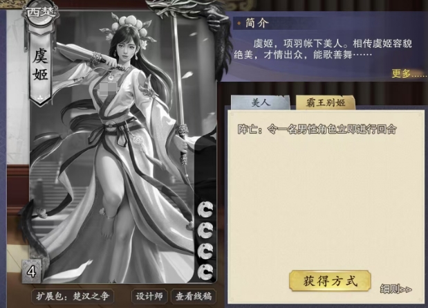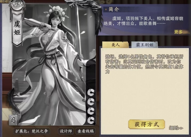 当然其实这个技能有一个很好突破的方法,就是另外一方不上男性武将卡就可以导致美人技能就无法发动,但是因为目前女性武将卡强度普遍没有男性武将卡那么强,所以这个突破技能的方式也很少有玩家用到,这种设定增加了游戏的变数和不确定性,使得玩家在游戏中需要更加谨慎地做出决策,同时在虞姬受到伤害即将生效时,如果此时霸王,即被指定的男性角色体力较低,那么对虞姬造成伤害的结果将变为虞姬失去体力,这种设定也增加了游戏的复杂。