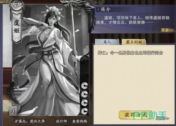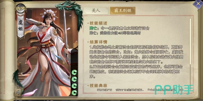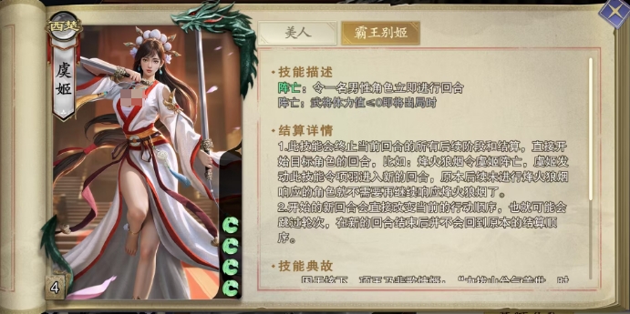 二技能霸王别姬是虞姬的另一个强大技能,当虞姬不幸阵亡时,她可以发动这个技能,令一名男性角色立即进入新的回合,这种设定打破了传统卡牌游戏中的回合顺序,具体来说就是当虞姬阵亡并发动霸王别姬技能时,当前回合的所有后续阶段和结算都会被立即终止,这意味着无论当前回合中还有哪些动作未执行或效果未结算,都会因为虞姬的阵亡而戛然而止,随后,戏会直接开始目标角色的回合,就像该角色刚刚完成了自己的回合一样。