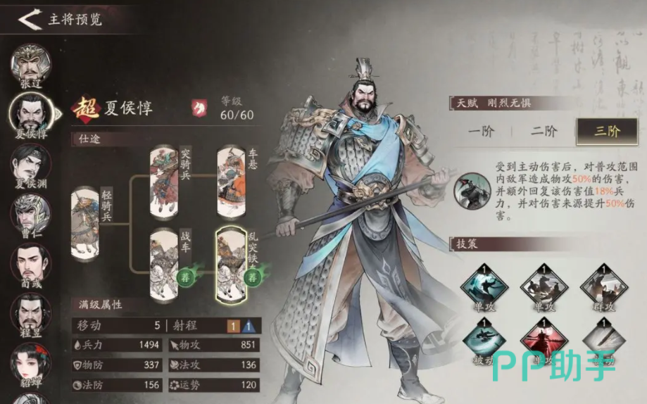 在游戏中,夏侯惇是一位高输出且具备一定生存能力的近战型武将。当角色升至满级后,其基础兵力值表现优异,能够在前线持续作战。尽管攻击距离较短,但凭借强大的物理伤害能力,可在短时间内对敌方造成显著打击。他拥有多项关键技能,其中“横刀跃马”是核心主动技之一。释放后可使敌军受到的伤害提升10%,同时自身所受伤害减少10%,实现攻防转换的效果,持续两个回合。这一技能适合在战斗初期施放,帮助队伍建立优势。