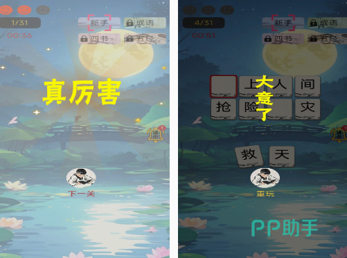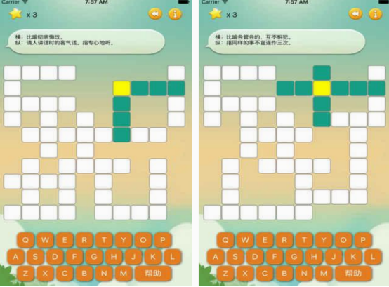 这同样是通过填写拼音首字母的方式,就能显示出各种文字的,除了涵盖四字成语,同时还有谚语以及诗词等内容。你需要在玩的过程中,仔细的观察方格的数量,如果能答对的情况下,就能过关,获得相应的金币奖励。主要的难点就是,玩家在玩的过程中有时间限制,你必须要争分夺秒,都要完成任务才可以,不然的话也会面临失败。