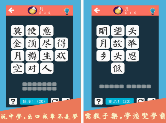 这款充满唯美画面设计的休闲趣味性小游戏,不仅涵盖了诗词,同时还有我国的四字成语,你都需要在玩的过程中,将词语顺利的填写完毕,保证可成立的情况下,就可进入下一个关卡。还游戏设置了各种阶段的进阶模式,如果你并不知道正确答案的情况下,通过系统自带提示的功能,帮助你更好地畅玩浏览与诗词有关的知识。
