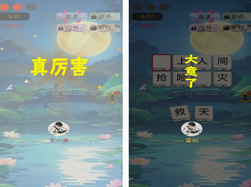 这款通过拼音首字母来猜成语的游戏,你也需要将成语填写完成,才能顺利通关,所以也是满足需求的。玩的过程中,你可在看到了文字的内容以后,利用拼音拼出来,保证每个字母所在的位置是正确的,才可以。在成语释义这方面,也能帮助大家提升这方面的见识,无论是常见的或者是不常见的,都能更好的了解,是语言学习非常好的帮手。