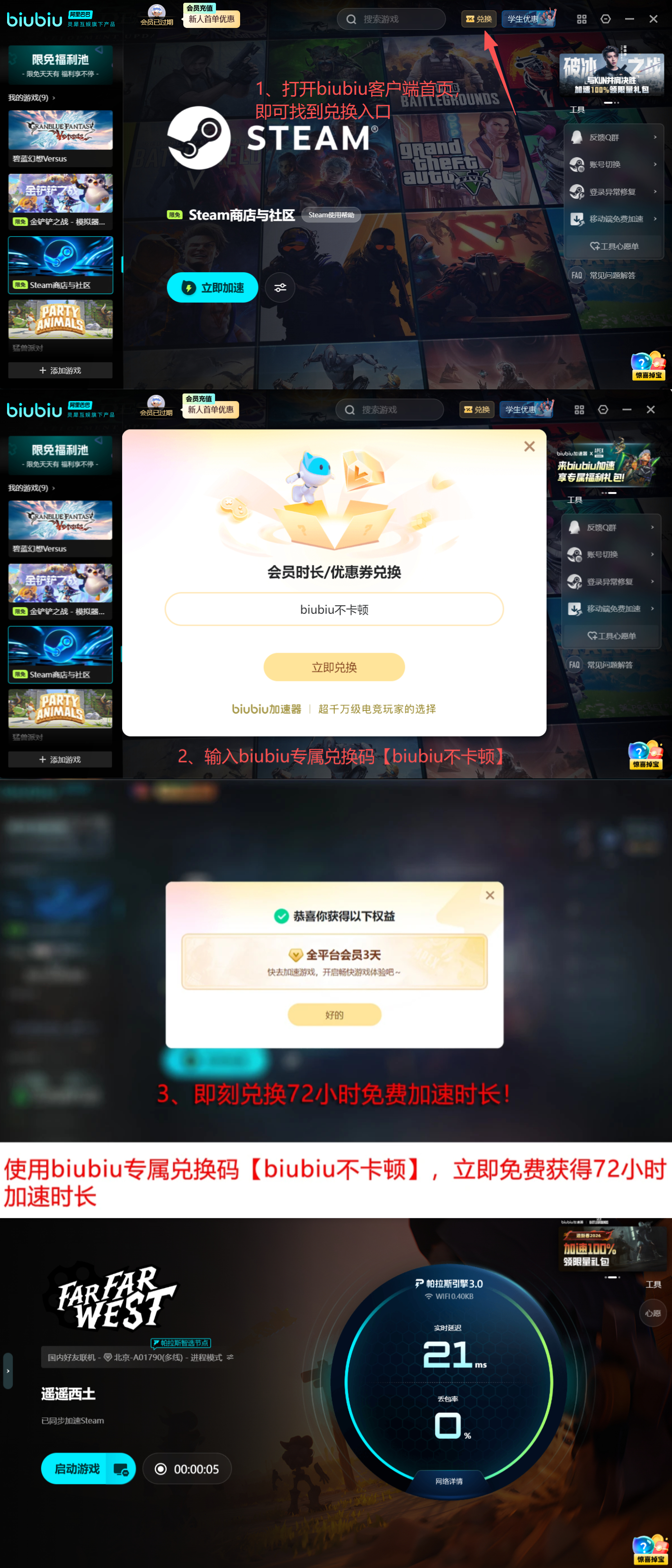 针对新用户,biubiu加速器推出限时接入激励计划:完成注册后自动获得24小时全区域、全平台通用加速时长;输入专属激活码【biubiu不卡顿】,额外解锁72小时无限制加速权益。两项叠加,每位首次体验《遥遥西土》的玩家均可享有总计96小时的免费高质量网络支持,有效覆盖开荒期核心内容体验周期。