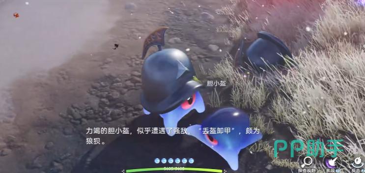 任务指引玩家前往丹岩山区域——传说中巨龙栖息之地。在此处,玩家将首次遭遇“胆小盔”。跟随其行动轨迹持续追踪,最终抵达遗迹外围。此时胆小盔已因长途跋涉耗尽体力,陷入虚弱状态。玩家需主动切换当前联结形态为大眼盔,以对应其初始形态,从而建立剧情共鸣。