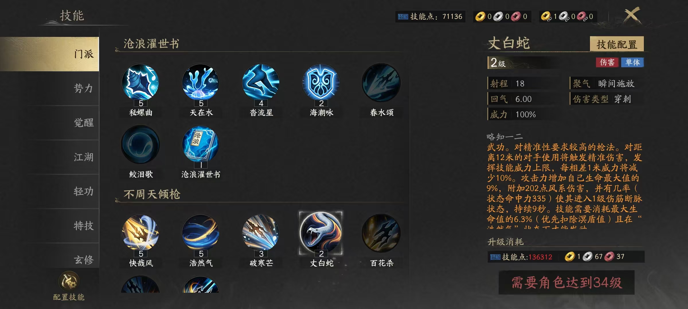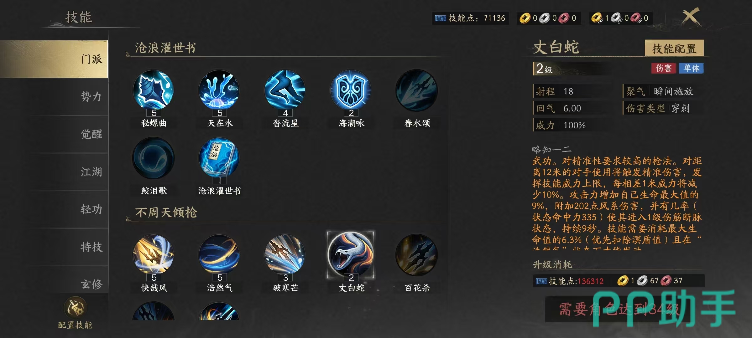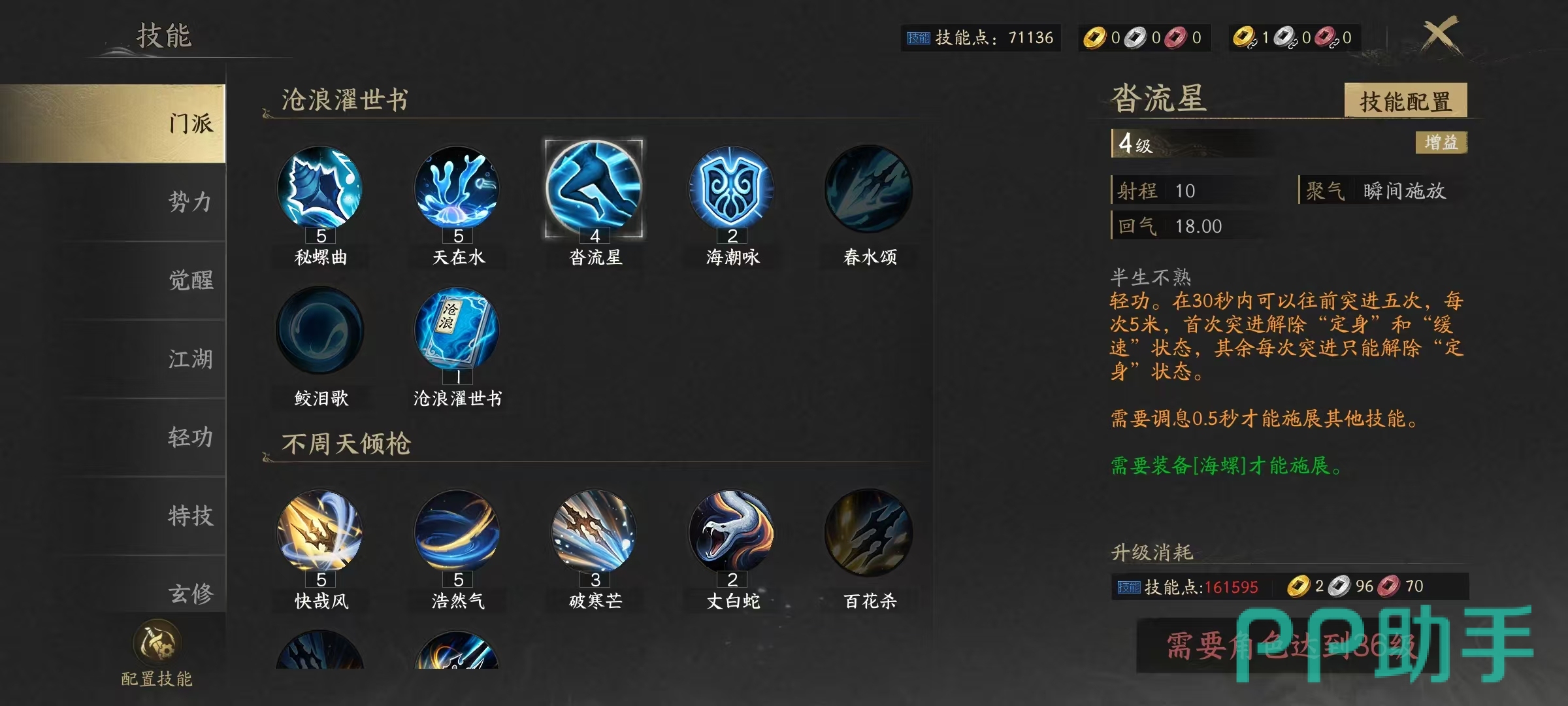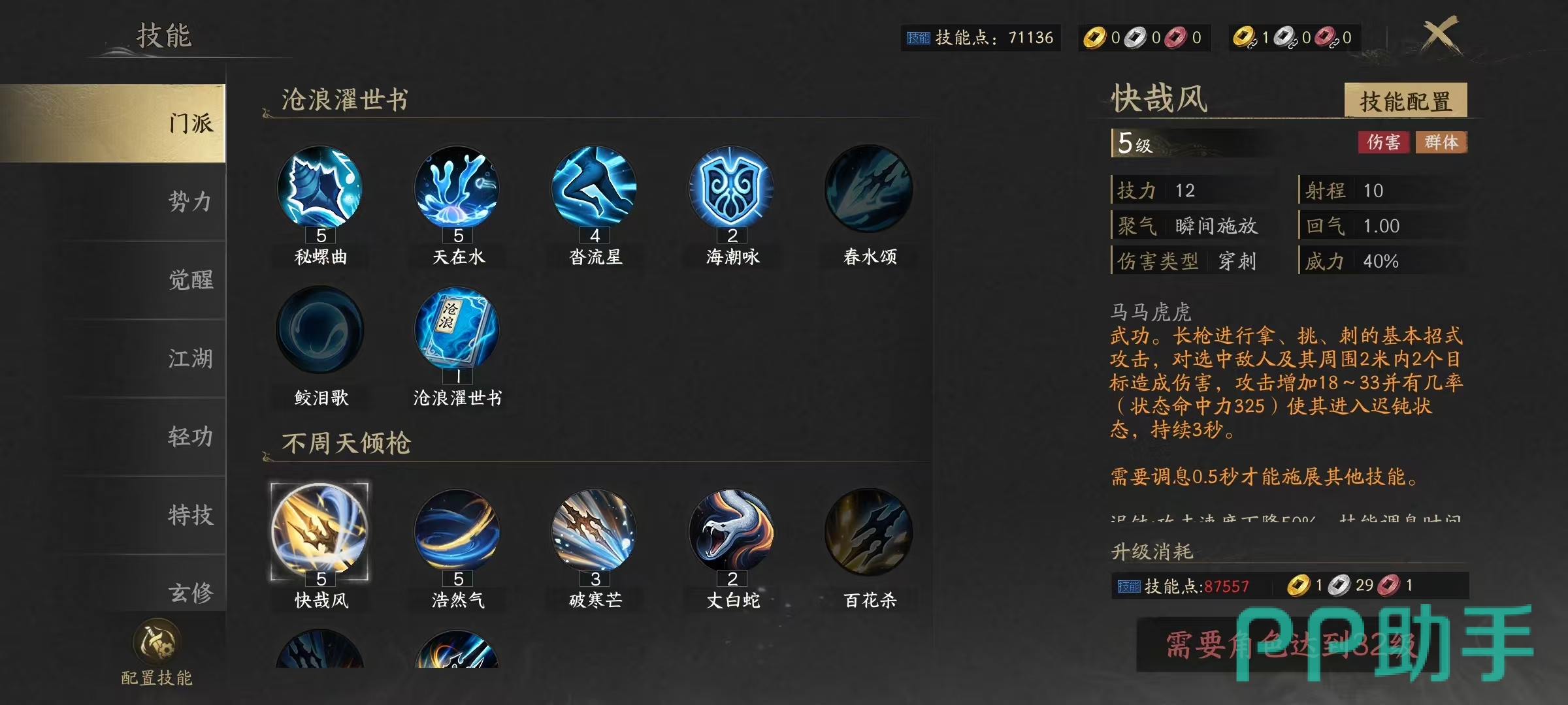 技能组合方面,玄溟构建了以“位移—距离—增伤—控场”为闭环的立体输出模型。首推核心技【沓流星】:具备三段可变向突进能力,不仅可主动发起进攻或规避关键伤害,更能在被控状态下强制解除定身、缓速等负面状态,是整套连招链的启动枢纽与保命底牌。第二核心【丈白蛇】为远程物理斩击技,伤害数值随施放距离动态变化,同时附带破甲与基于自身生命值提升物理攻击的双重增益效果,对走位预判与距离把控提出较高要求。第三项【浩然气】属被动心法类技能,依据角色力属性百分比加成物理攻击力,构成基础输出支撑。第四技【百花杀】为贴身范围技,兼具高额近战伤害与短时控制效果,常用于衔接位移或打断敌方技能释放。第五技【快哉风】为基础扇形物理攻击,命中后附加迟钝减益,有效限制对手机动性,是压制与追击环节的关键辅助技能。