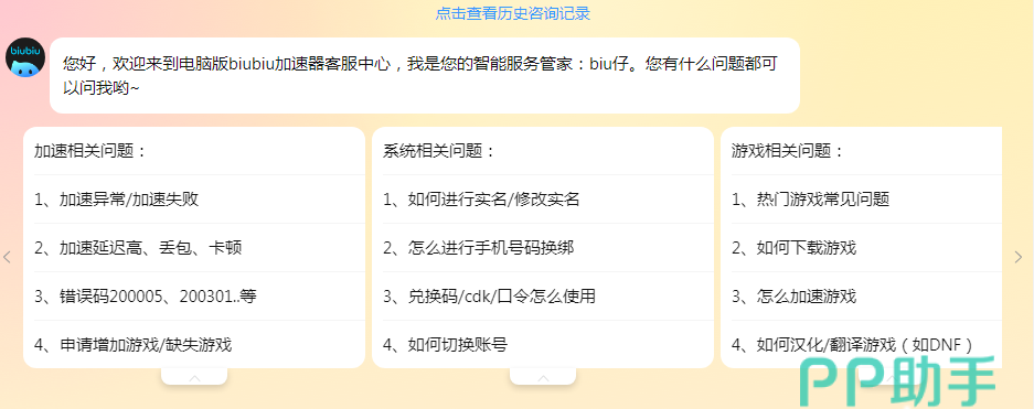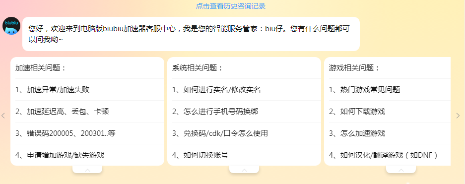 biubiu的使用方式很简单,每款游戏都是通过蓝色按键来加速的,点击即可启动,游戏结束以后再回到页面来结束加速。初次使用biubiu的小伙伴如果有什么不明白的地方可以向智能客服寻求帮助,点击智能客服就会看到一些常规问题的解决方法。如果这些无法解决你的问题,还可以将问题登记反馈给后台技术人员进行排查解决。