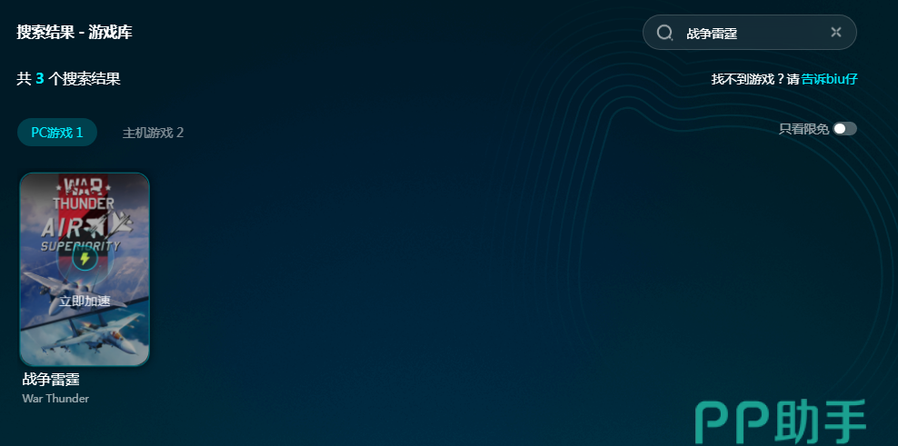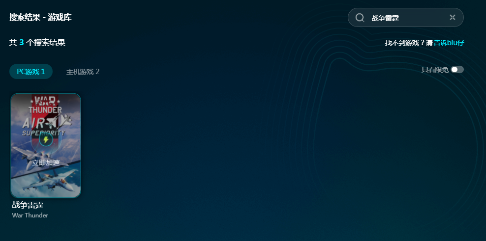 现在biubiu正好有免费试用的活动,只要注册了新用户就能享受24小时免费加速,新用户首充折扣也很低,只要15元起就能充值会员了。小编还给大家申请到了额外3天免费加速的福利,所有用户到软件当中输入【biubiu不卡顿】兑换码就能领取。免费的加速时长搞定了,接下来只要搜索战争雷霆找到加速资源就能畅玩起来了。