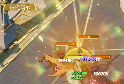 巴赫朗的必杀技“神圣御空”一开始就颇为独特。开战后,他会获得一个比例生命值的护盾,还能获得额外的生命上限。最神奇的是,这部分额外生命值并不会直接影响他的当前生命,而是以每秒损失的方式逐渐消失。当他的生命恢复到最大值后,他就会展开双翼进入“神临”状态。此时,他不再丧失额外生命上限,且在普通攻击时会对前方扇形范围内的所有敌人造成伤害。简单来说,巴赫朗在战斗初期即能获得一定的防护和持续恢复的能力,进入“神临”状态后更是变得如神明般强大,给敌人带来巨大的威胁。