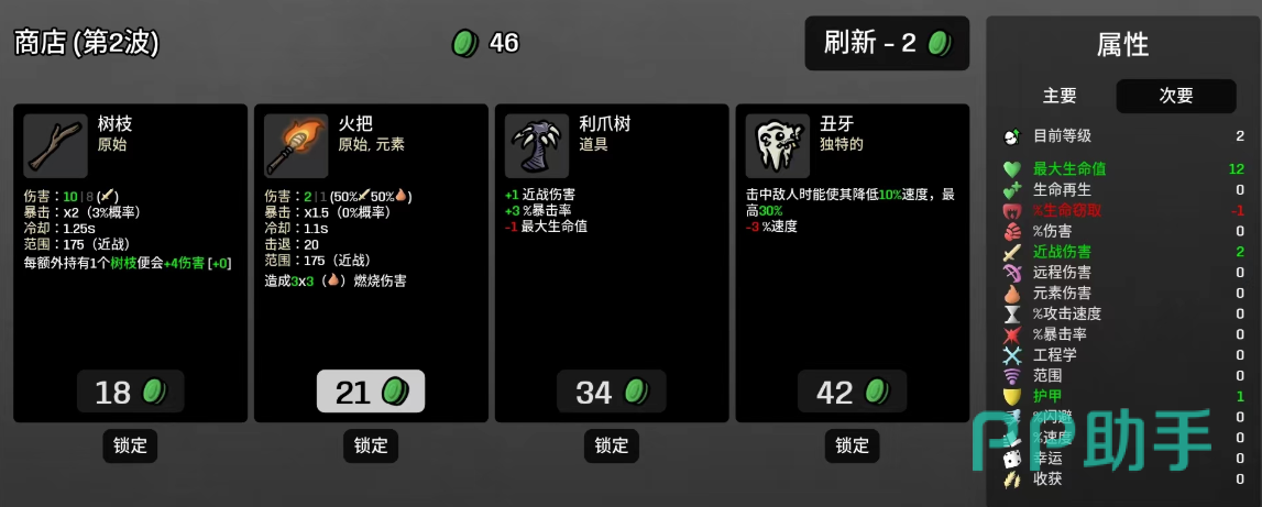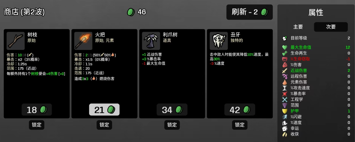 开局阶段应立即确立树枝获取目标,放弃其他武器试探性尝试。商店刷新时主动筛选树枝选项,金币富余时仅作少量刷新,杜绝冲动购置非树枝类装备。每根树枝提供+4基础伤害,集齐6根后触发完整增益,总伤害跃升幅度显著。树枝本身获取成本低,副本掉落稳定,是性价比最优的核心组件。
