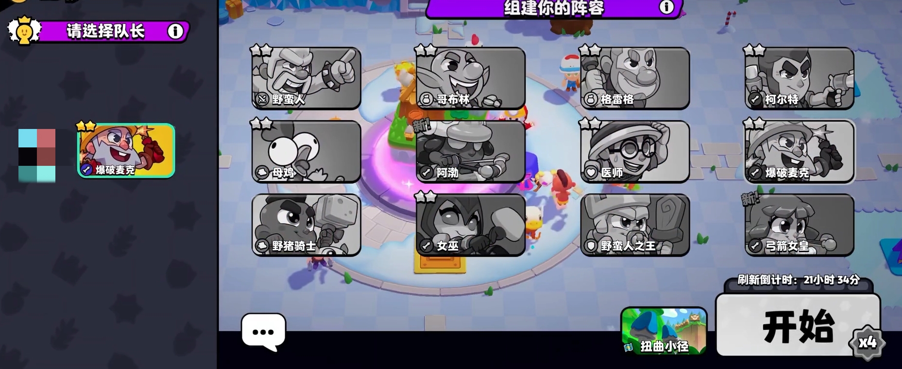 麦克队成型后的伤害非常夸张,而且队长模式又会直接送合体麦克,所以前期可直接偏发育的角色(哥布林、格雷格等),后期先补野猪骑士提高阵容防御,有阿渤和医师的话也尽量拿,后期可配上弓箭女皇来协助自己输出。此外,若担心拿不到鞋子,最后上一张母鸡来确保移速。