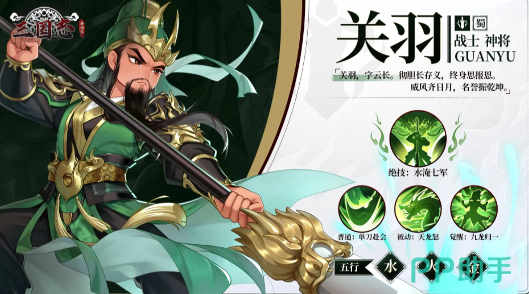 角色在游戏里的战力是非常强的,可以使用最普通的单刀赴会技能攻击目标,也可以用水淹七军这个必杀技,直接对面前前排的目标进行攻击,除了常规的伤害之外,还有一定的概率可以让他们被附加水系易伤的效果,有了这个效果之后,队伍里其他的水角色在攻击的时候,也能得到伤害的叠加。