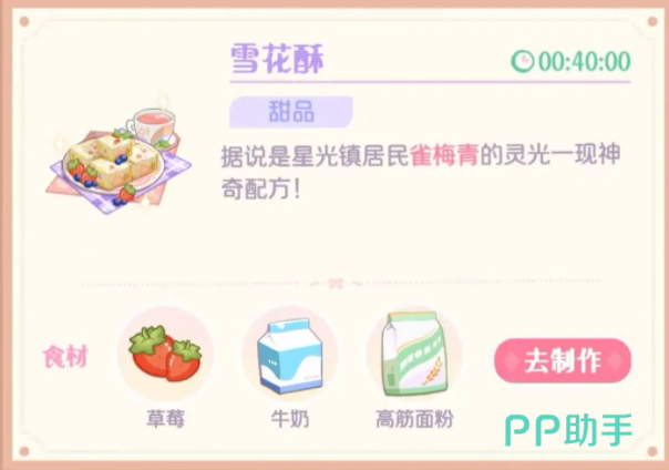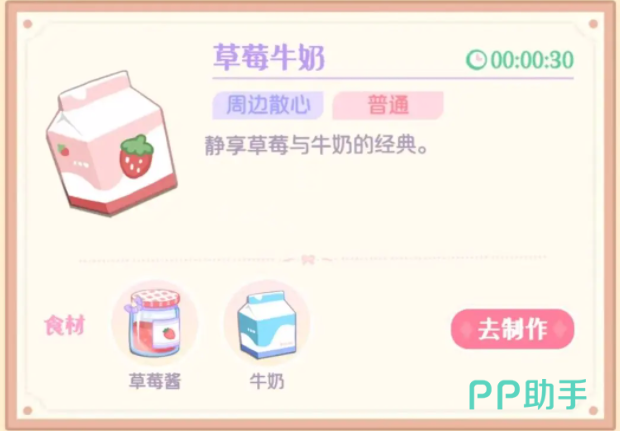 另外可以直接把草莓酱和牛奶搭配起来,这样就能制作出草莓牛奶,是非常适合在周边散心的时候食用的一种饮品,并且只需要消耗玩家30秒的时间,也可以选择把面团和牛奶组合起来,这样就能做成奶香贝果,适合在短途旅行的时候使用,耗时只需要1分钟,另外牛奶还可以搭配草莓和高筋面粉做成雪花酥,这是居民们都非常喜欢的一种甜品。