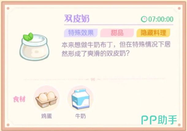 另外牛奶还可以和鸡蛋搭配制作成双皮奶,这是一个隐藏料理,在游戏里需要耗时7个小时,但这个食材能产生特殊效果,玩家可以尝试去游戏里,通过消耗这两种比较基础的食材,制作出双皮奶这种特殊料理。