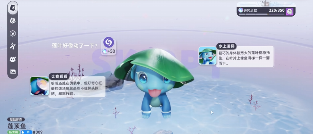 水属性治疗向伊莫,填补队伍中续航职能空白。主动技能“治愈之水”提供两段式恢复效果:首次施放恢复全体队友相当于自身最大生命值6%的生命;随后进入持续治疗状态,每秒恢复量为施放者最大生命值的1%。该机制特别适配主C输出间隙切入治疗,保障后台单位生存稳定性。进化为顽皮鱼后,获得2级游泳能力,提升水域移动效率;后续可进一步进化为莹冰龙,新增冰属性,拓展环境适应性与战术应对面。