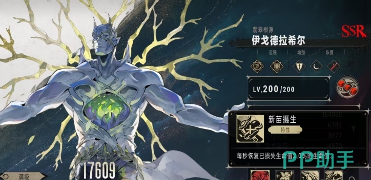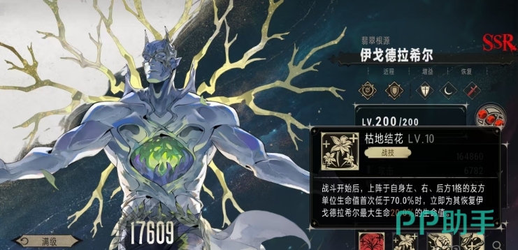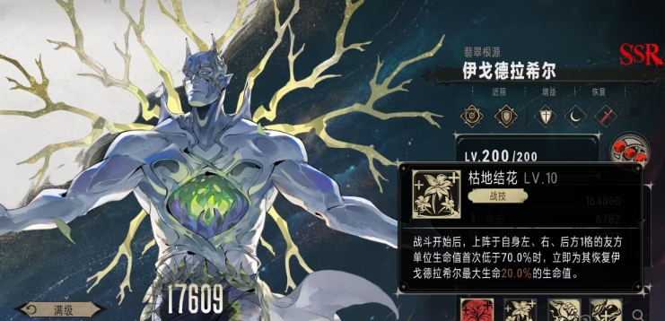 最为关键的当属伊戈德拉希尔的战技以及奥义技能,先来说说战技,当战斗正式开始后,伊戈德拉希尔会依据自身在战场上所站的上阵位置,可以根据自己左边、右边以及后方 1 格范围内的友方单位的生命值状态带来触发的效果,一旦这些友方单位的生命值首次降低至 70%以下,伊戈德拉希尔便会迅速启动战技,为其恢复生命值,这个恢复量是按照伊戈德拉希尔自身的最大生命值的 20%来计算的,而伊戈德拉希尔本身血量就相当可观,这就使得其战技所带来的治疗效果十分出色。