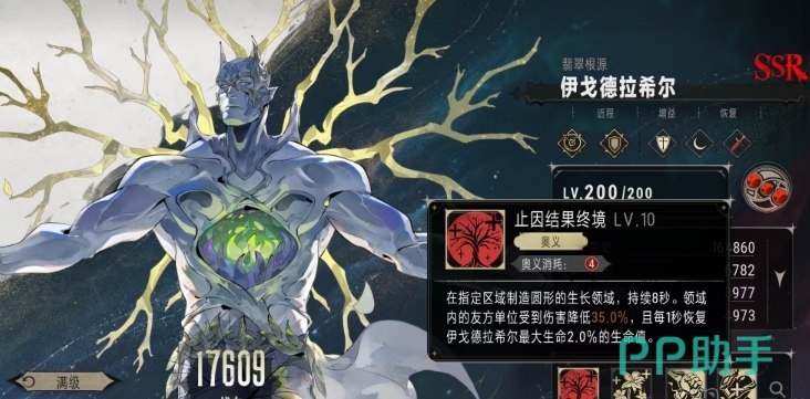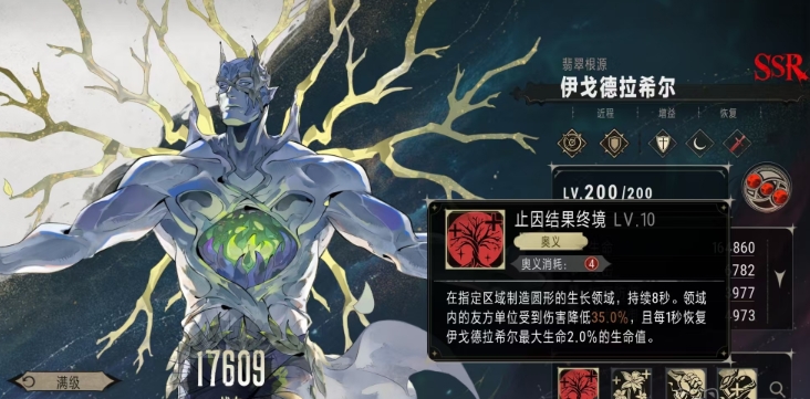 伊戈德拉希尔的奥义技能名为止因结果终境,当玩家在战场上巧妙指定区域后,伊戈德拉希尔便能凭借此技能制造出一块圆形的生长领域,这个生长领域能够持续 8秒钟之久,在这 8 秒的关键时间内,所有处于该领域之中的友方单位都将获得生存保障,一方面,他们所受到的伤害会大幅降低35%,能有效地减少伤害数值,另一方面每秒钟这些处于领域内的友方单位,包括伊戈德拉希尔自身,都能够恢复其最大生命值 2%的血量。
