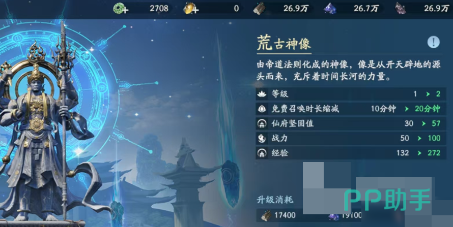 卡池并非初始开放,需随主线推进逐步解锁。当玩家完成荒古神庙相关章节后,即可抵达荒古神像场景——此处即为卡池功能所在地。界面中“召唤”与“升级”两项操作均与抽卡深度关联:选择“升级”,可提升仙府坚固值与经验,同步缩短免费召唤冷却时间;该行为完全不影响召唤次数产出,反而能稳定增加每日免付费召唤额度,属高优先级前置培养动作。
