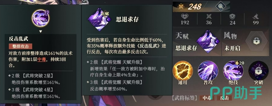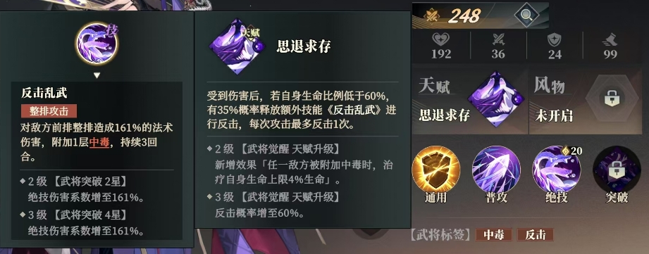 随着贾诩在战斗中的觉醒与突破,他的天赋技能也不断得到强化与升级,在2级武将觉醒天赋升级后,贾诩的反击乱武技能新增了一个令人瞩目的效果,每当任一敌方被附加中毒状态时,贾诩便能治疗自身生命上限4%的生命,而当3级武将觉醒天赋升级达成时,贾诩的反击概率大幅提升至60%,这意味着他在战场上有更多的机会对敌人进行致命反击。