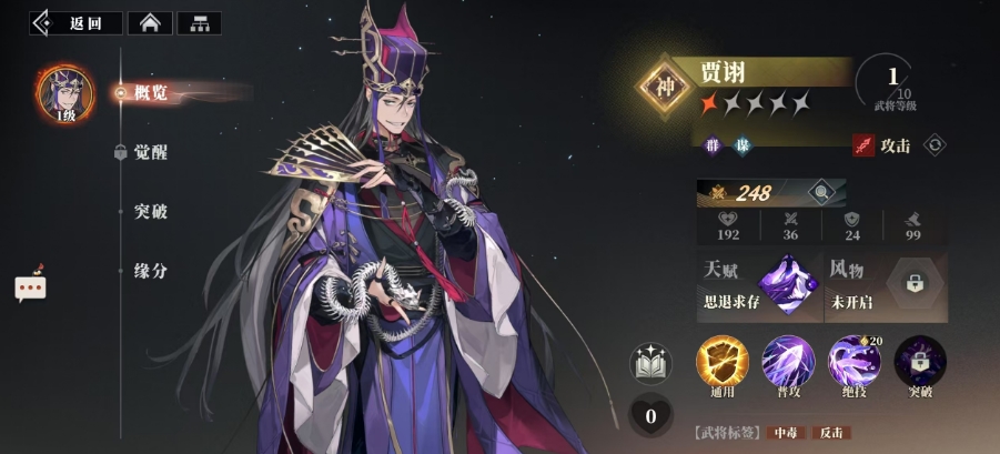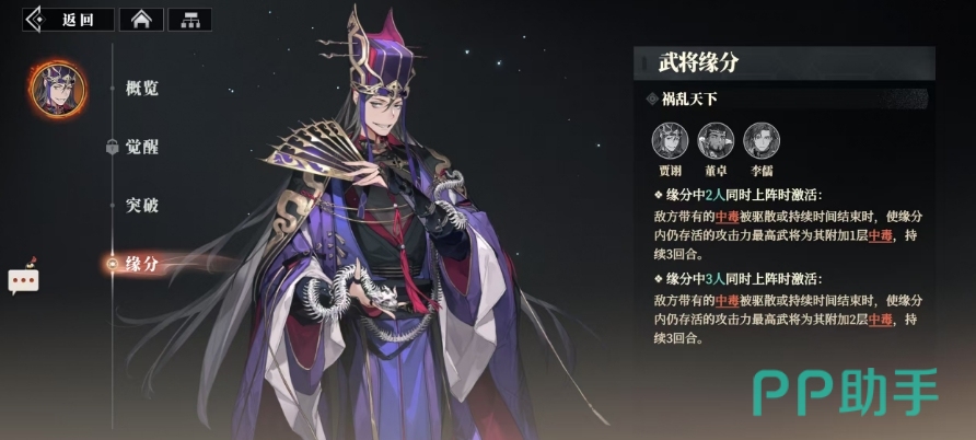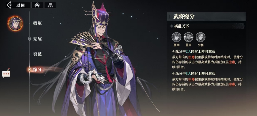 与此同时,贾诩的反击乱武技能在经过2星突破后,绝技伤害系数进一步提升至161%,这一提升使得他的反击技能更加凌厉,对敌人造成的伤害也更为可观,而在4星突破时,绝技伤害系数再次得到强化,达到了更高的161%,除了自身的天赋技能外,贾诩还拥有着独特的武将缘分祸乱天下,当他与董卓、李儒这三位乱世奸雄中的两人同时上阵时,一旦敌方带有的中毒状态被驱散或持续时间结束,缘分内仍存活的攻击力最高武将便会立即行动,为敌方附加1层中毒,这层中毒同样能持续3回合,而当这三人同时上阵时,仍存活的攻击力最高武将会对敌方附加2层中毒。