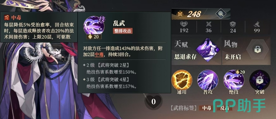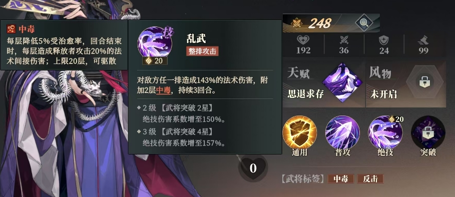 而他的绝技乱武,当贾诩发动这一绝技时,他会对着敌方任一排发动猛烈的攻击,瞬间释放出143%的法术伤害,不仅如此此次攻击还会附加2层中毒效果,并且这一中毒效果将持续3回合,随着贾诩在游戏中的成长与突破,当贾诩达到2星武将突破时,他的绝技伤害系数会增加,从原本的143%提升至150%,而当贾诩突破至4星时,绝技伤害系数再次得到强化,达到了157%。