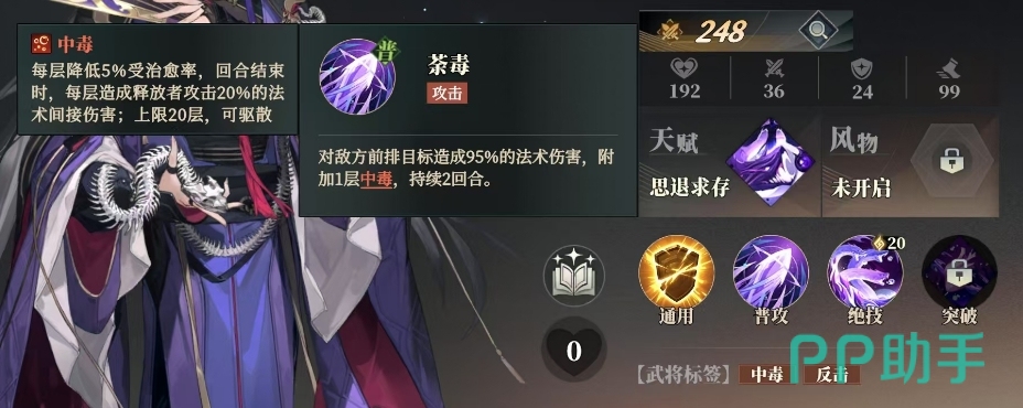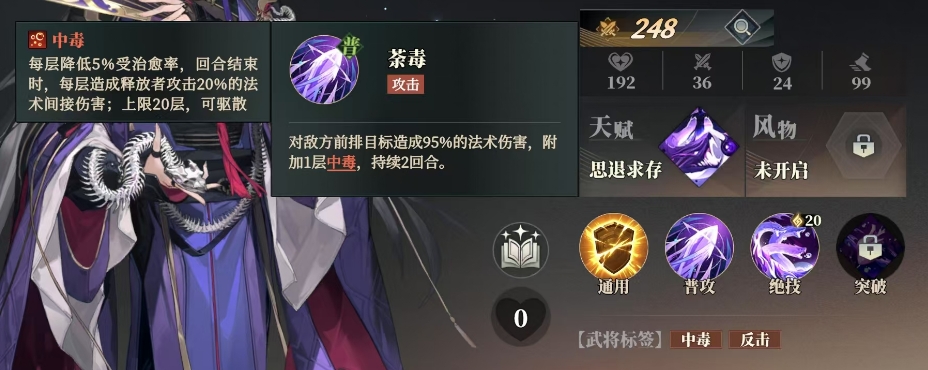 贾诩自带的中毒效果是当敌人陷入中毒状态时,每一层中毒都会使其受治愈率降低5%,这意味着敌方在遭受攻击后,想要通过治疗手段恢复元气很困难,而且中毒效果会在回合结束时发挥更为恐怖的作用,每层都能造成释放者攻击20%的法术间接伤害,其上限更是高达20层,然而需要注意的是,这一强大的效果也并非坚不可摧,它是可以被驱散的,这就要求玩家在战斗中灵活运用策略保护好己方的中毒效果。
