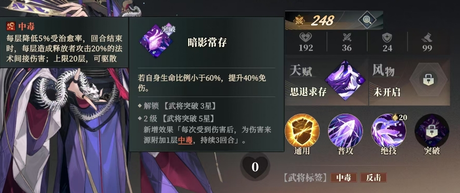 此外贾诩还拥有一项独特的突破技能叫做暗影常存,当自身生命比例小于60%时,他会自动触发这一技能,获得40%的免伤效果,这一技能就像是为贾诩披上了一层坚固的护盾,当贾诩突破至5星后,暗影常存技能更是得到了进一步的升华,新增了一个极为强大的效果,每次受到伤害后,贾诩都能为伤害来源附加1层中毒,且此中毒效果可持续3回合。