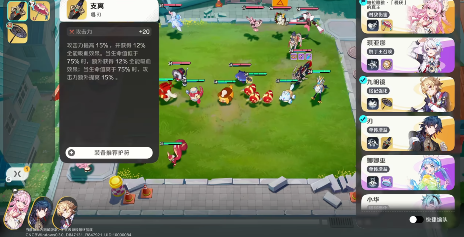 除法则外,刃配套专属护符“支离”,提供三层叠加增益:基础提升15%攻击力;赋予12%全能吸血;当佩戴者生命值高于75%时,全能吸血效果翻倍至24%。该护符显著强化持续作战能力,尤其适配具备自疗、减伤或护盾机制的高练度主力精灵。需注意的是,其增益存在阈值依赖——若精灵长期处于低血量状态,将无法激活翻倍效果,实际收益将回落至常规水平。因此,推荐将“支离”优先配置给具备稳定回血手段(如技能回复、被动吸血、队友治疗链)或高生存模组的C位精灵,以最大化输出与续航双维度收益。