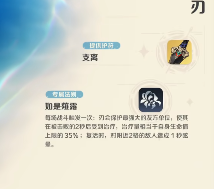 刃的核心法则名为“如是薤露”,具备唯一性触发机制:每场战斗仅生效一次。该法则自动锁定我方进阶等级最高的精灵(即“最强大友方单位”),在其被击败后2秒内施加等同于刃自身生命上限35%的治疗量,实现功能性复活;同时,复活瞬间对半径2格范围内所有敌方单位施加1秒眩晕效果。该设计兼顾保核、反打与控场三重维度——既规避了关键输出单位的永久减员风险,又借复活窗口制造敌方行动断档,大幅增强阵容整体韧性与战术延展性。