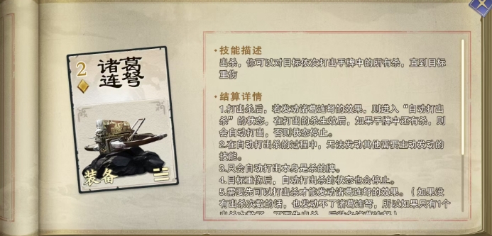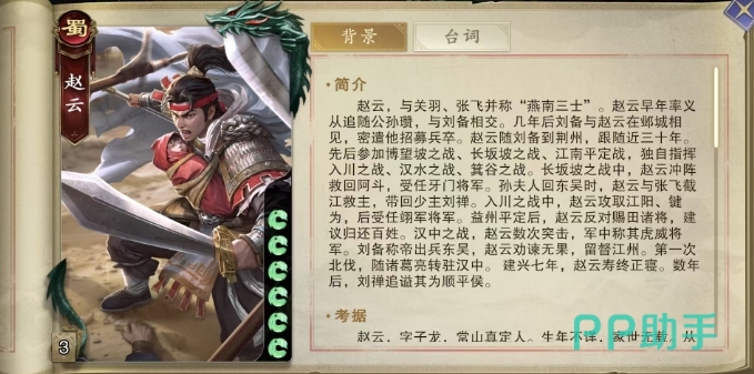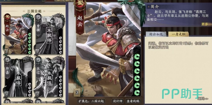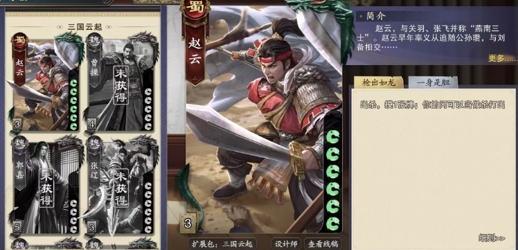因为诸葛连弩能让赵云一次性打出手中所有的杀,但这里的关键在于,即使有了枪出如龙的加成,也不会因为诸葛连弩的效果而将手牌中的闪自动视作杀打出,这一细节的设计,既体现了游戏设计师对平衡性的考量,也要求玩家在享受赵云带来的战斗快感时,必须更加细致地规划每一步行动,尤其是在构建手牌组合和应对复杂战况时更要注意,所以说这是一张易于上手且实力不俗的武将牌。