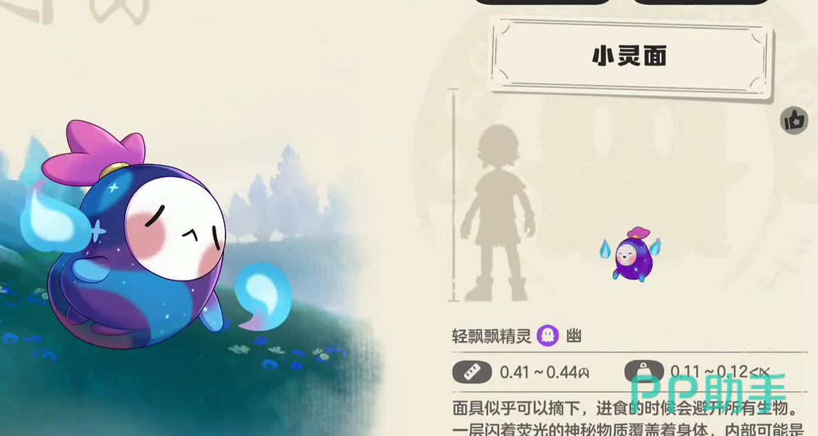 小灵面被设定为“轻飘飘精灵”,性格偏向内向且略带社恐,在大世界互动时会表现出害羞或躲闪的可爱神态。其幽灵属性决定了它具备一定的隐匿能力,这也影响了玩家在野外遭遇时的操作策略。