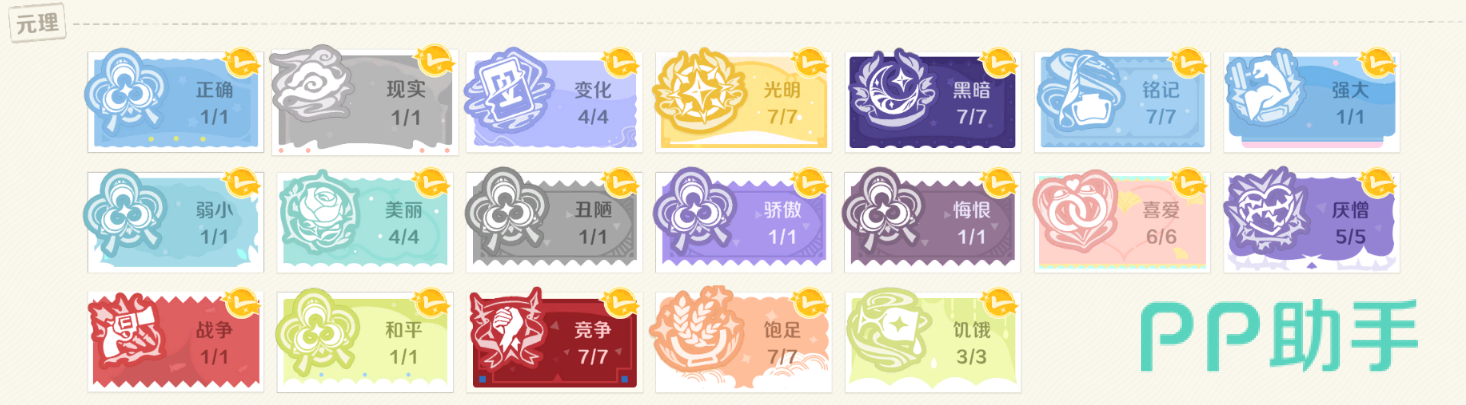 “元理”可理解为精灵的本质分类体系,类似于传统设定中的种族概念,用以区分不同精灵的根本属性。目前游戏中已实装19种元理类型,分别为:“正确”、“现实”、“变化”、“光明”、“黑暗”、“铭记”、“强大”、“弱小”、“美丽”、“丑陋”、“骄傲”、“悔恨”、“喜爱”、“厌憎”、“战争”、“和平”、“竞争”、“饱足”和“饥饿”。每一种元理都对应特定的增益效果或战术倾向。