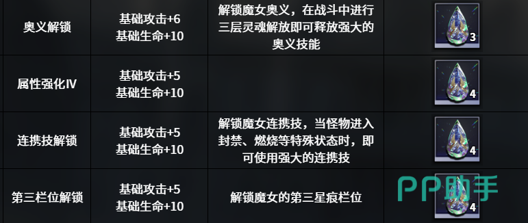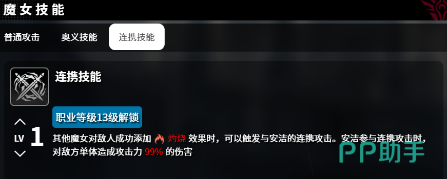 安洁的连携技触发条件十分特殊:只要其他魔女成功施加“灼烧”状态于敌人身上,便会激活她的协同反击。此时安洁立即发动一次针对敌方单体的强力攻击,再次造成99%的伤害。这种联动机制不仅增强了战斗节奏感,也显著提升了整体输出效率。当角色成长至15级,她将掌握奥义技【真理之章】,通过双手合十释放本源之力,对全体敌人造成高达210%的范围伤害,是清场与压血线的关键手段。