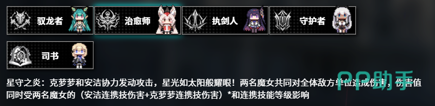 在组合技方面,安洁具备强大的协战潜力。当她与其他魔女共同发动交叉冲击时,能形成覆盖全场的复合打击效果。最终伤害受多重因素影响,包括安洁自身连携技的等级、配合角色的连携技强度及其技能等级。例如,与律搭档时可增强连锁爆发;而与克萝萝联手则会触发“星守之炎”,对所有敌方单位造成叠加性重创。同样地,若与米娅组成双人组合,也能激发出更强的群体压制力,体现极高的战术兼容性。