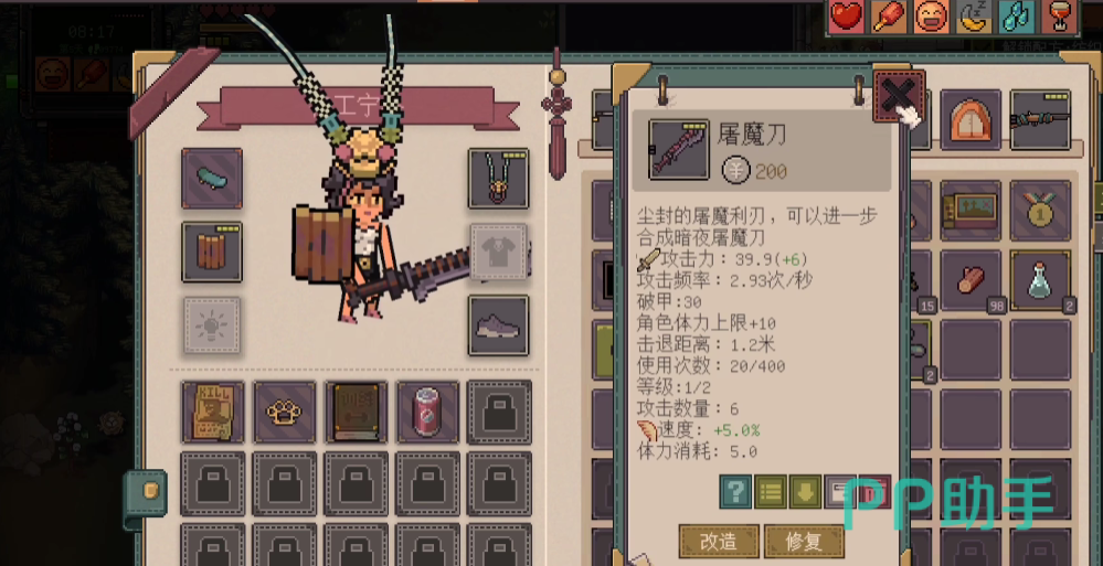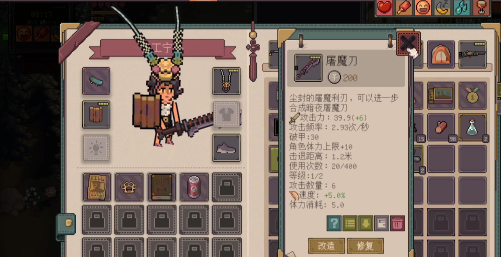 在《腐朽默示》这款游戏中,屠魔刀被广泛视为近战职业的高阶核心装备之一。其综合性能突出,不仅基础攻击力高达39.9,攻击频率达每秒2.93次,还具备30点破甲效果;装备后可提升角色10点体力上限,并附带1.2米击退距离。每次挥砍消耗5点体力,移动速度提升5%,攻击范围覆盖6个目标单位。该武器初始售价为200金币,耐久度为400次使用,需定期维修。尤为关键的是,屠魔刀是合成进阶武器“暗夜屠魔刀”的必要前置材料,战略价值显著。