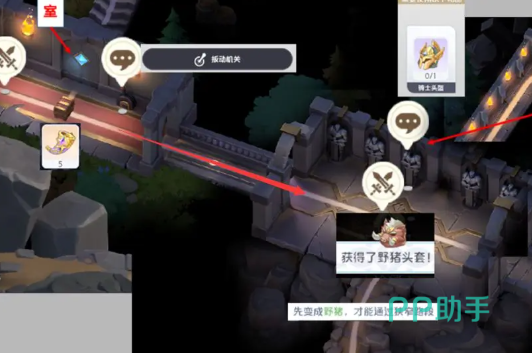 离开密室后继续右行,此战目标为获取野猪头套——该道具是贯穿后续流程的关键形态转换组件。使用时需点击屏幕右下角形态切换按钮,变身为野猪方可通过狭窄通道;但需注意,野猪形态不具备战斗能力,遇敌前务必切回人形,否则将导致流程中断。获得头套后,可见墙面新增气泡机关,暂不处理。先下行至左侧区域,拾取第3个宝箱;再进入右侧房间,取得蓝色解锁道具。