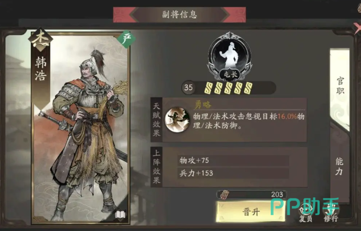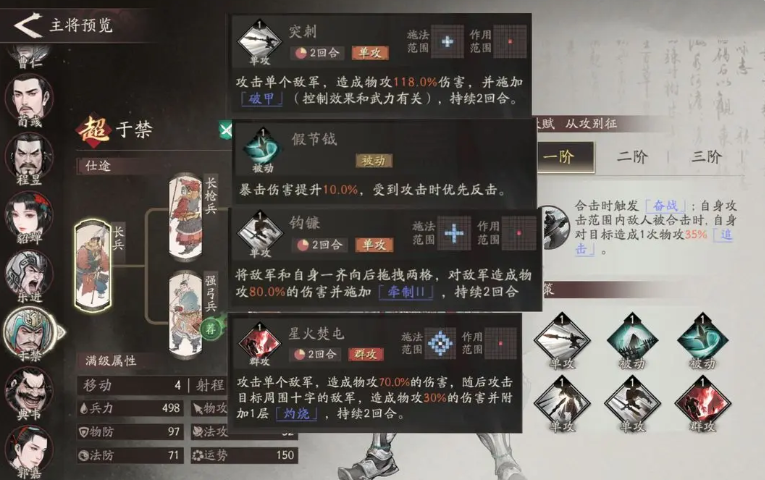 由于于禁通常作为弓兵单位出场,因此对高暴击与会心属性依赖较高。装备选择上应优先考虑提升物理攻击力的套装,以契合其后期技能的伤害模型。副将方面,韩浩和麹义为优选组合。前者拥有破甲能力,有助于打出接近真实伤害的效果;后者则能在高暴击状态下进一步放大伤害输出。