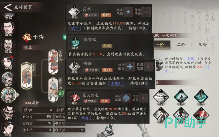 理想阵容中,可将于禁与貂蝉、乐进、程昱共同编组。貂蝉提供的再动机制极大提升了战术灵活性,乐进具备强制位移能力,便于调整战场站位,而程昱则是当前版本强势武将之一。于禁手持节钺掌控阵型,辅以火焰之力进行范围打击,结合物法双修的特性,令敌方难以有效规避其全面压制。