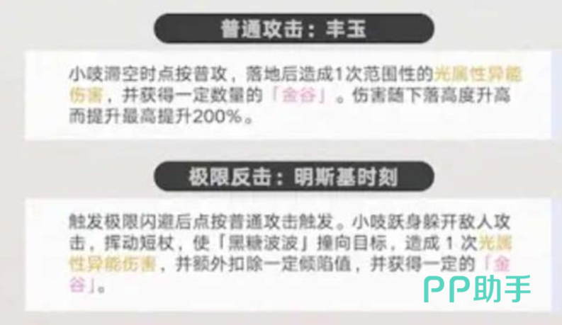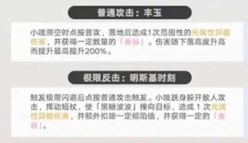 小吱具备滞空普攻触发机制:空中按下普通攻击可释放“丰玉”,落地瞬间对大范围敌人造成光属性伤害,且伤害随下落高度递增,最高可达基础值的2倍。该技能兼具清场效率与地形压制能力,适用于群怪环境与BOSS战中的位移压制场景。