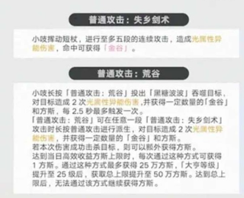 小吱的基础输出循环由三种普通攻击形态构成,形成稳定可控的连段结构。首段技能为“失乡剑术”,一套五段光属性连击,每次命中敌人都可获得1点金谷。该技能是整套循环的起始支点,也是资源积累最可靠的方式,建议新玩家优先打磨命中率与节奏感,确保连段完整释放。