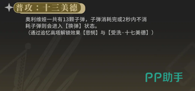 奥利维娅的核心普攻技能名为十三美德,能一次性发射13发子弹,象征着十三种美德之力。相较于常规角色仅有的三到五次连击设定,该技能提供了更高的基础输出频率。需要注意的是,在打完全部弹药后,必须在两秒内完成换弹动作,才能维持输出节奏。因此,在实战中应选择安全时机进行装填,避免在敌人攻击范围内暴露过久。
