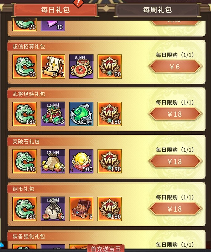 l宝物强化礼包:18元,含180宝玉、500女娲石、5传说武将随机碎片、180VIP经验。