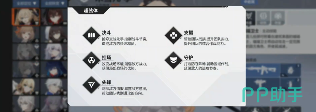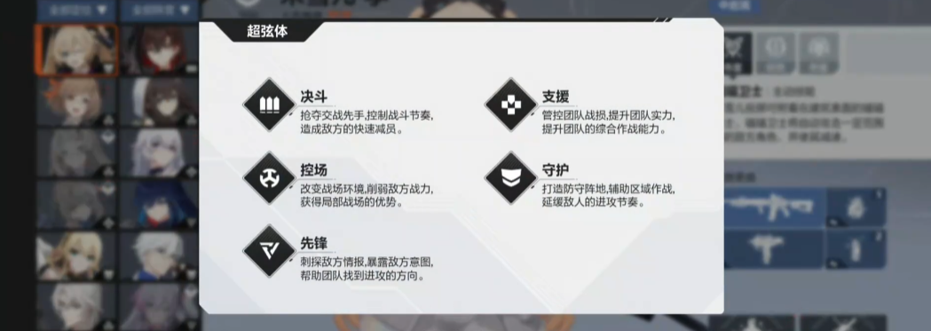 游戏中目前设有五大职业分支:守卫、援助、决斗、先锋以及随机应变。每种职业在团队中承担不同职责,技能设计也各具特色。守卫型角色具备较强的生存能力,擅长阵地防守与前线抗压;决斗者则专注于高爆发输出,常用于突破敌方防线,其技能多带有范围伤害或控制效果,部分还能限制对手的弦化行为。