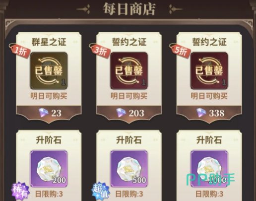 日常商店是前期资源获取的基石。其中,“群星之证”每日一折必购,“誓约之证”三折以内建议立即入手;升阶石按角色培养节奏按需领取;挑战券七折时可适量储备。开服初期钻石相对宽裕,务必每日刷满“好运商店”,优先兑换抽卡道具与高价值角色碎片。金币在后期塔防副本中几乎永不枯竭,无需采购;而四星狗粮长期紧缺,遇即拿下。若开局钻石有限,仅锁定每日商店核心项,暂缓所有抽卡行为。